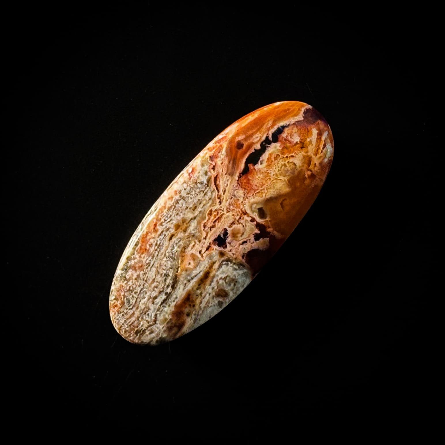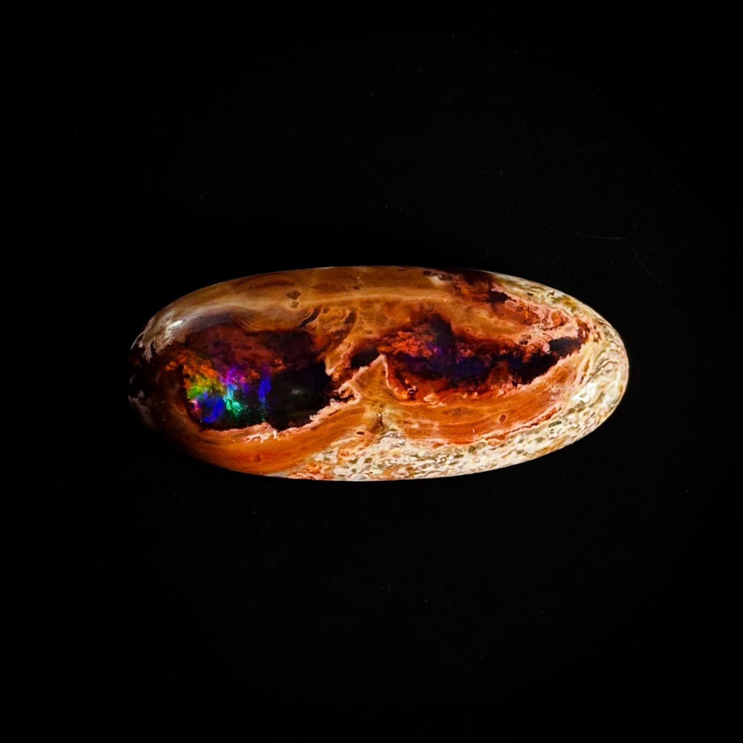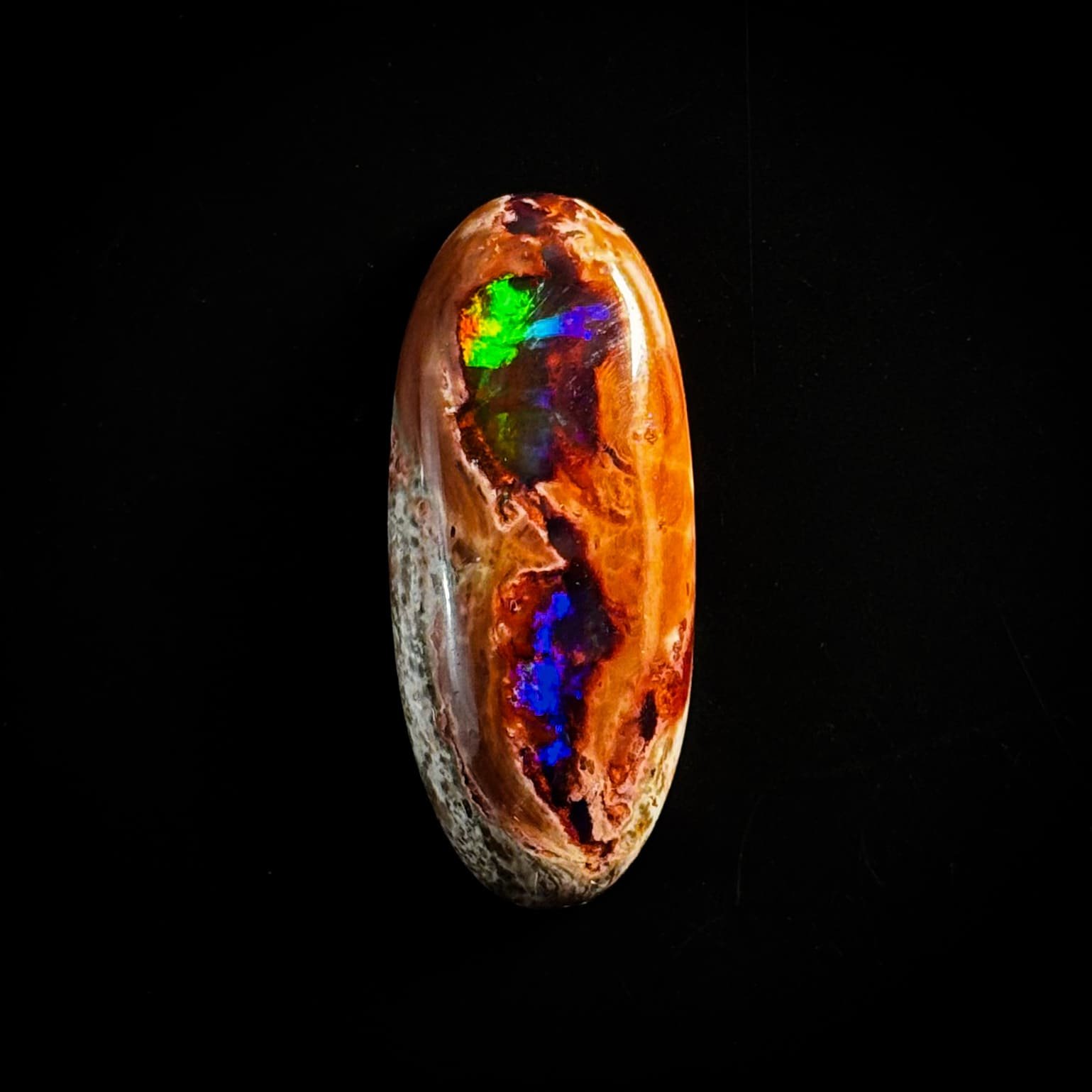 Ópalo de Fuego en cabujón de cantera, con piel de cristal transparente y una expresión cromática suprema. Destacan con fuerza los tonos morados y verdes, acompañados por sutiles matices azul celeste, además de dos ojos de ópalo que refuerzan su carácter natural. Una pieza definida y auténtica, con presencia notable dentro de su categoría.