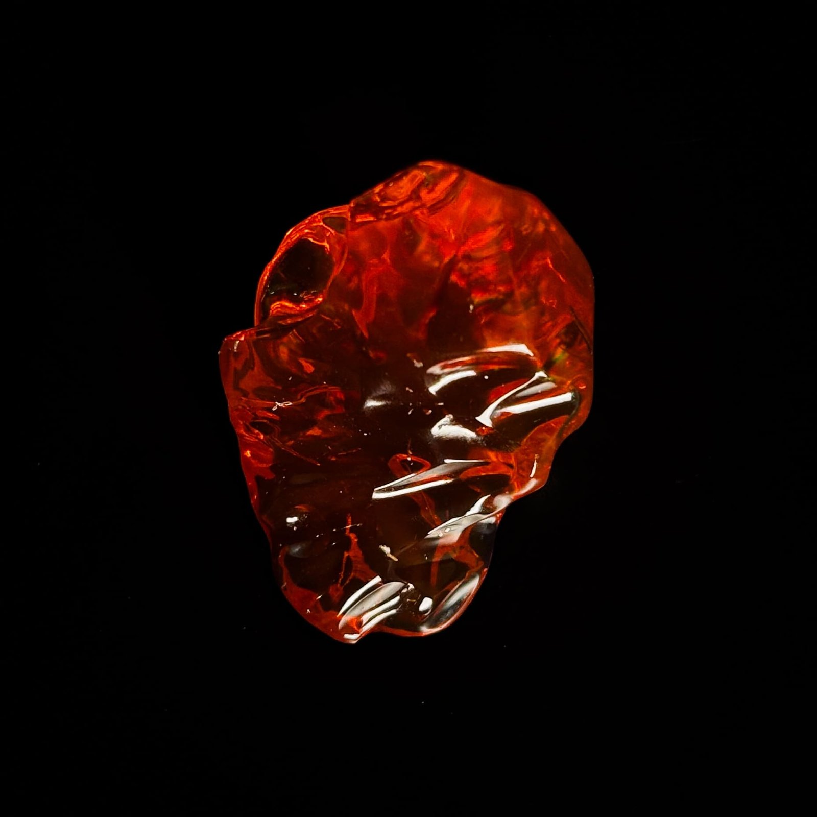 Ópalo de Fuego en tono naranja intenso, con cristal definido y formaciones internas tipo araña. La iridiscencia revela destellos verdes, rojos y naranjas, con sutiles matices morados que aportan profundidad y distinción. Una pieza sólida y elegante, de valor excepcional.