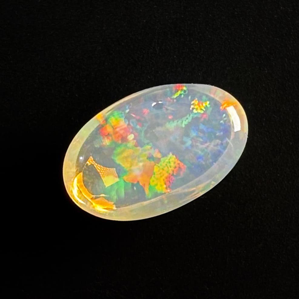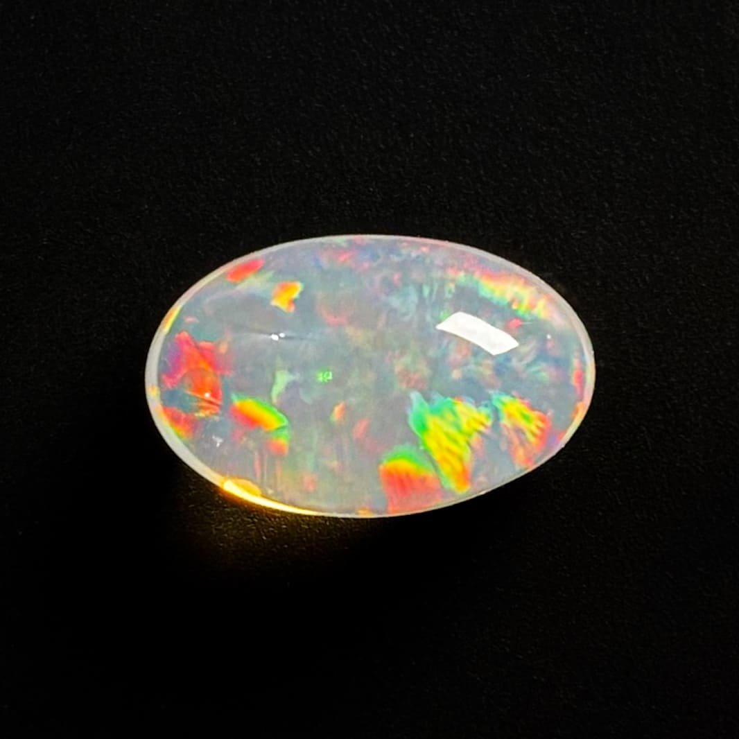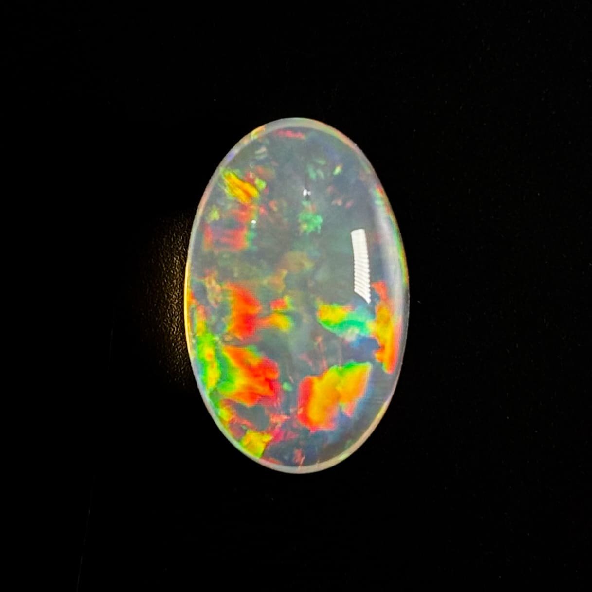 Ópalo de Fuego blanco en cabujón pulido, de presencia limpia y elegante. Su iridiscencia suprema tipo confeti despliega una gama rica y equilibrada de destellos rojos, amarillos, verdes, morados, anaranjados y sutiles matices azules. Una pieza refinada, luminosa y de gran atractivo para joyería de alto nivel. Piedra blanca nueva