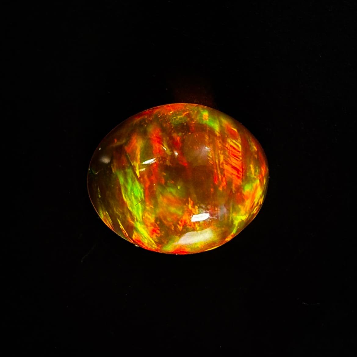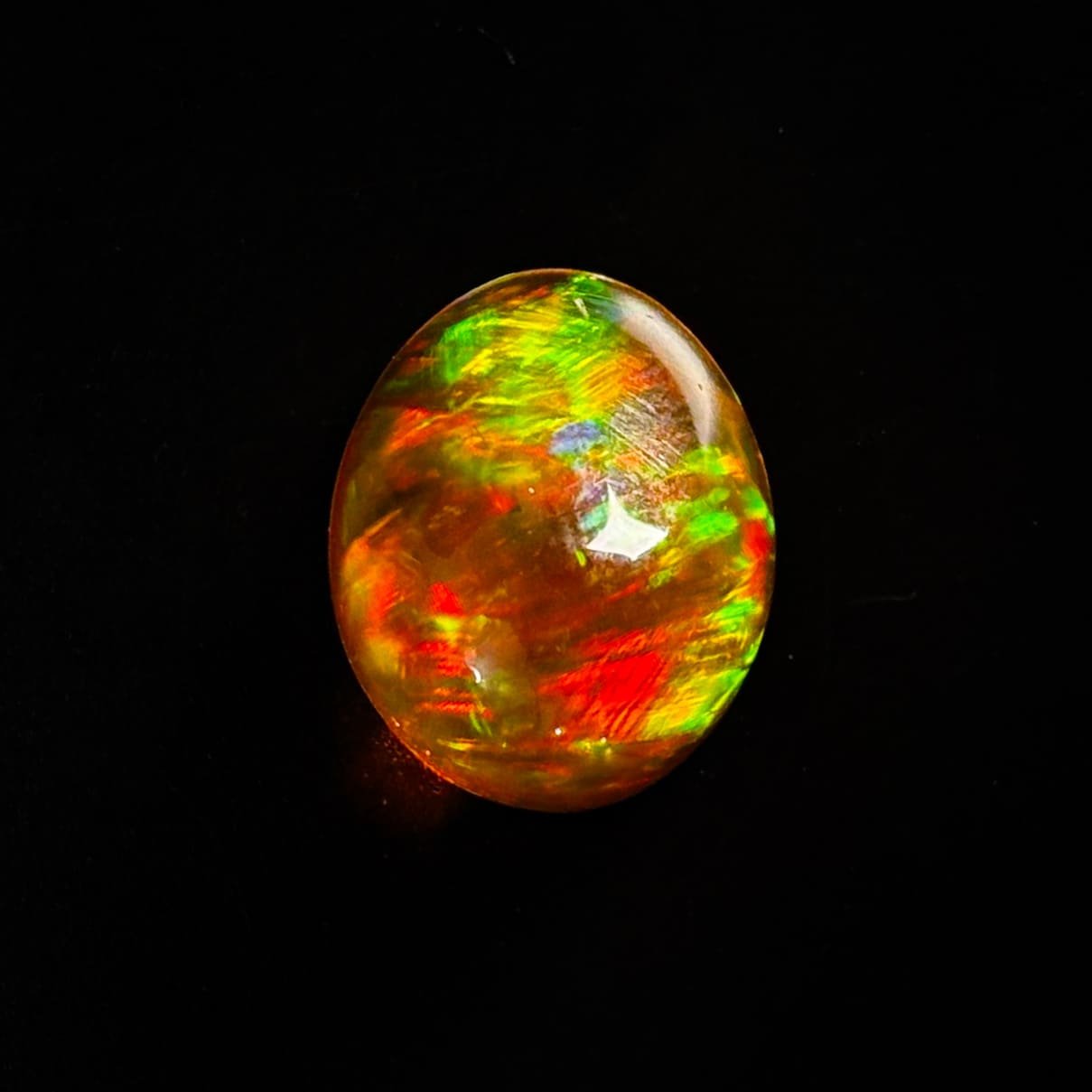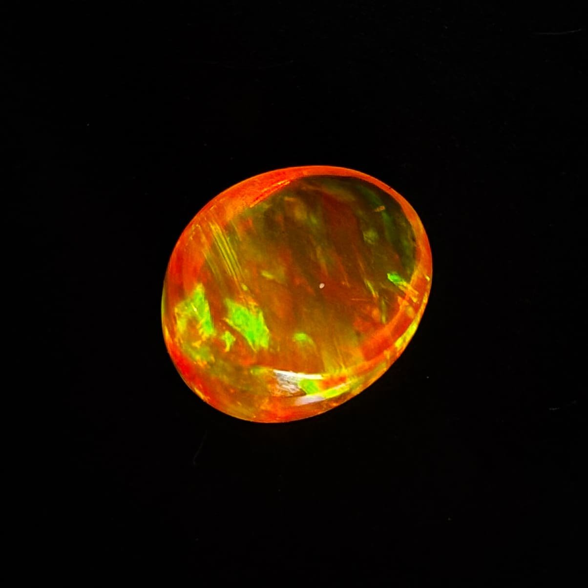 Ópalo de Fuego en un naranja refinado, tallado en cabujón en forma de gota, con formaciones internas tipo araña que aportan distinción. Su iridiscencia suprema abanderada se expresa en destellos verdes, rojos y amarillos, definidos y equilibrados. Una pieza única, de elegancia sobria y valor excepcional.