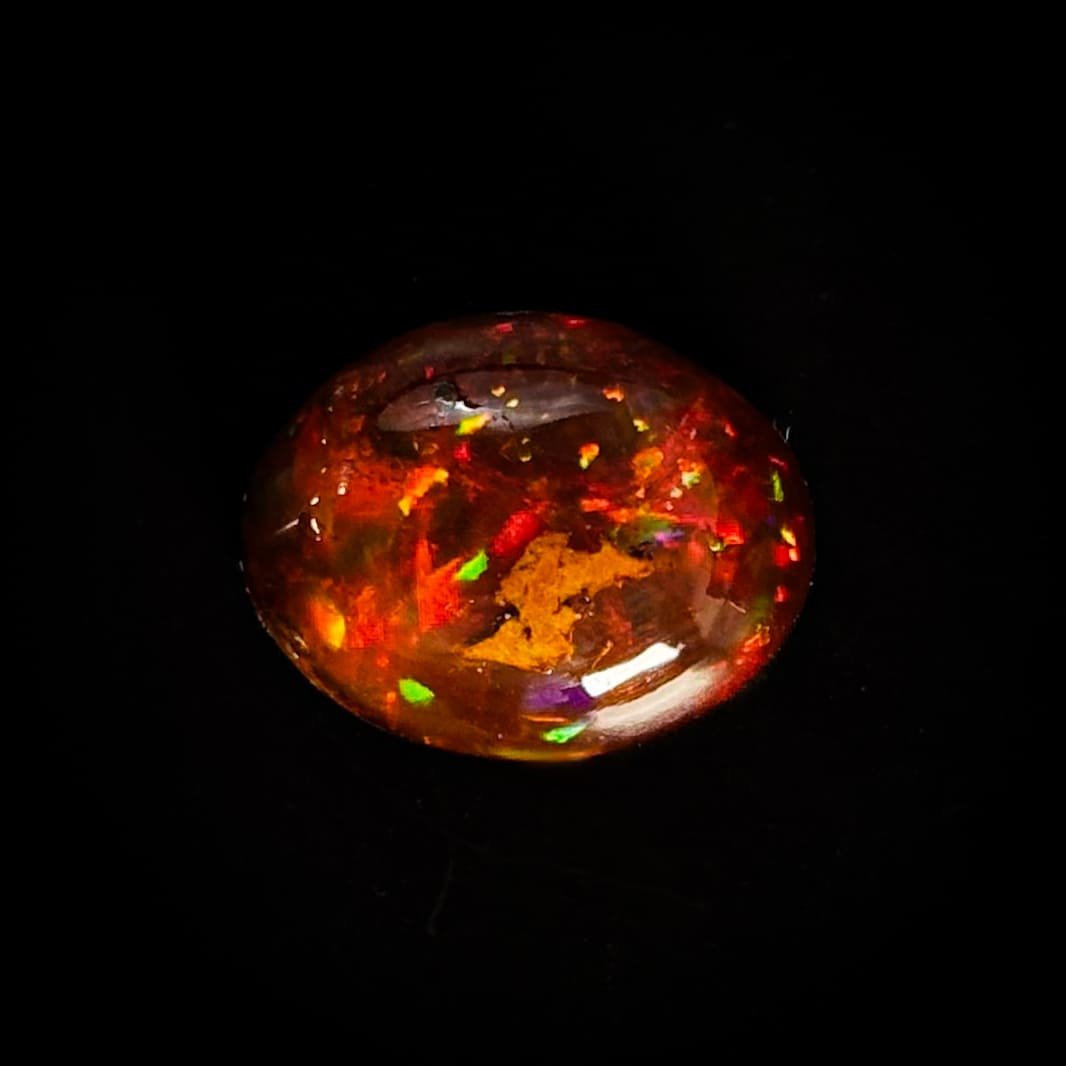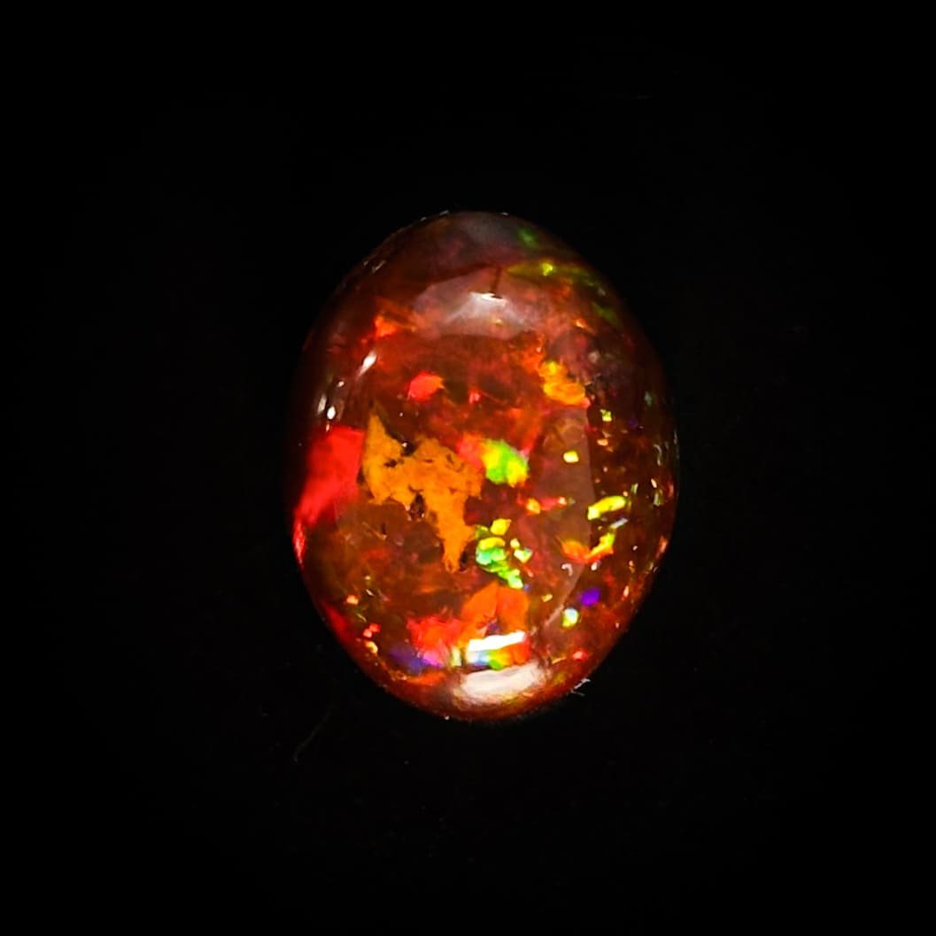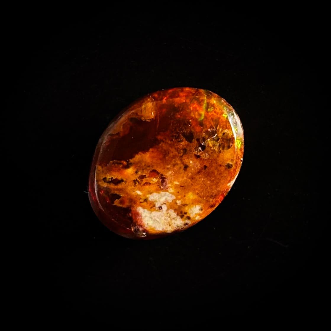 Ópalo de Fuego renegrido, de tonalidad profunda cercana al negro y difícil de encontrar. Su iridiscencia suprema combina lluvia y confeti, revelando destellos rojos, verdes, amarillos y morados. Una pieza pequeña pero excepcional, de carácter raro y alto valor. Piedra dragón