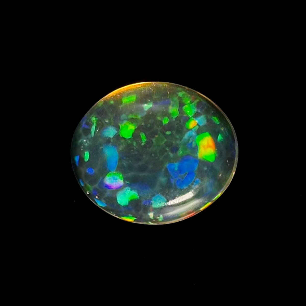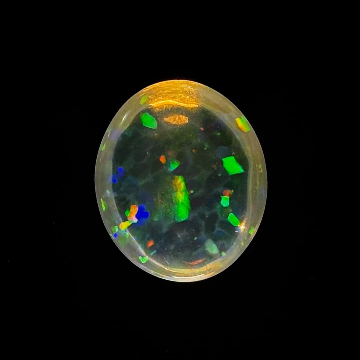 Ópalo de Fuego transparente, tallado en cabujón perfecto. Sus venas internas definen su carácter, mientras la iridiscencia suprema se expresa en un confeti intenso de color que responde a la luz. Una pieza refinada y escasa, de alto valor y presencia discreta.